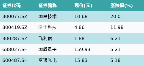 截至午间收盘,量子科技主题涨跌幅最高的五只股票为:国民技术(300077.SZ)、浩丰科技(300419.SZ)、飞利信(300287.SZ)、国盾量子(688027.SH)与亨通光电(600487.SH)。详情见下表: