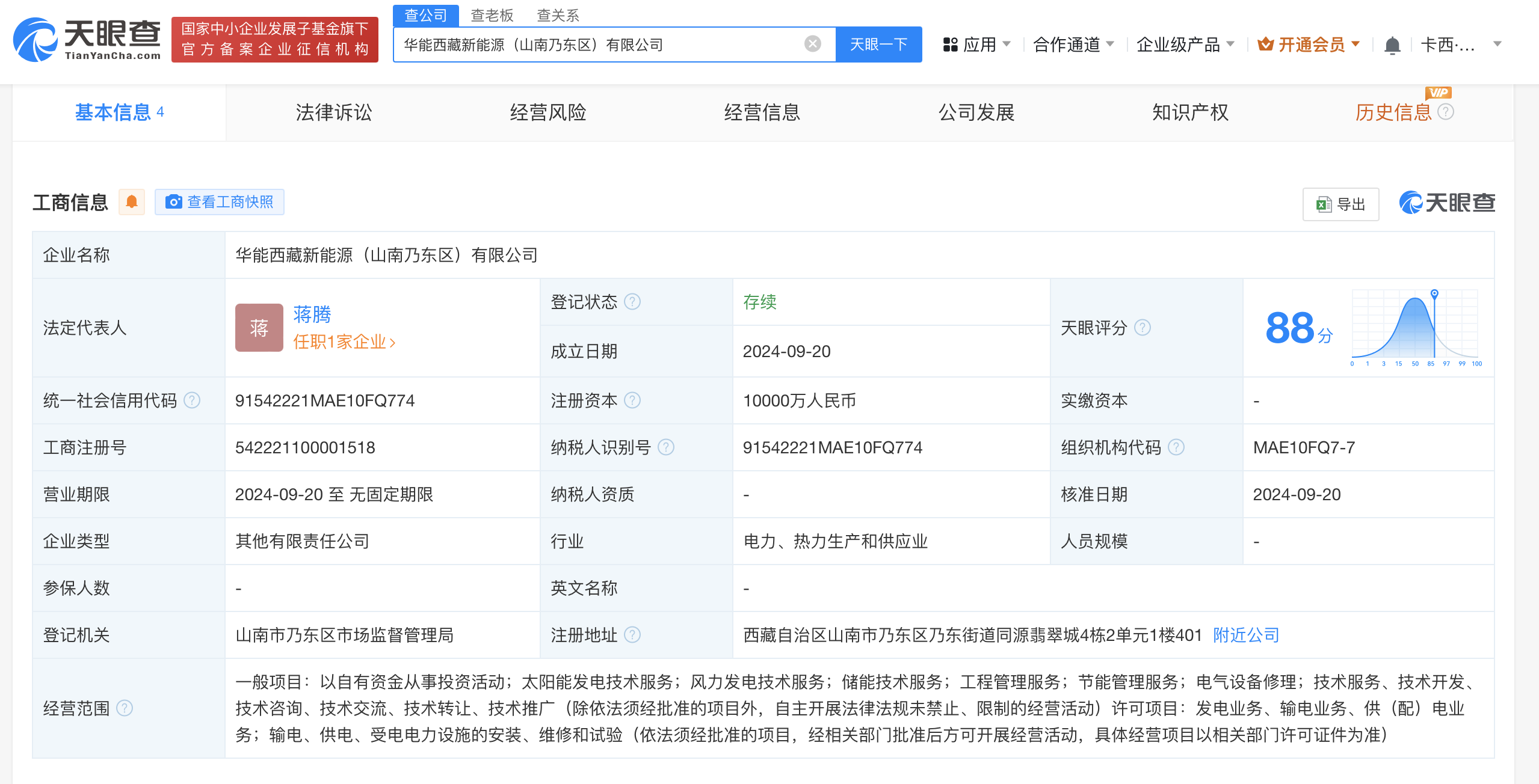 南方财经9月24日电,天眼查App显示,近日,华能西藏新能源(山南乃东区)有限公司成立,法定代表人为蒋腾,注册资本1亿人民币,经营范围含太阳能发电技术服务、风力发电技术服务、储能技术服务等。股权全景穿透图显示,该公司由华能西藏雅鲁藏布江水电开发投资有限公司全资持股,后者为中国华能集团有限公司全资子公司。