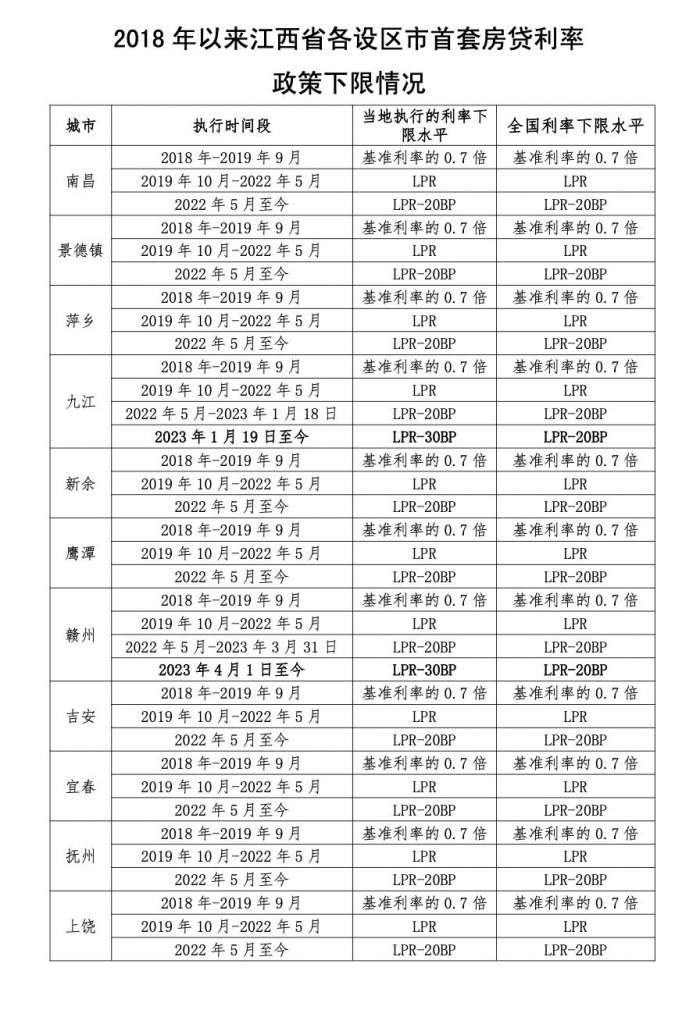 江西:发布2018年以来江西省各设区市首套房贷利率政策下限情况