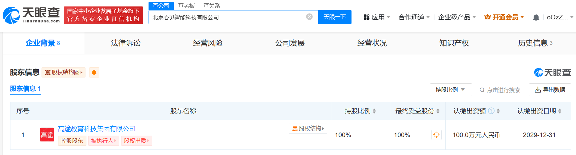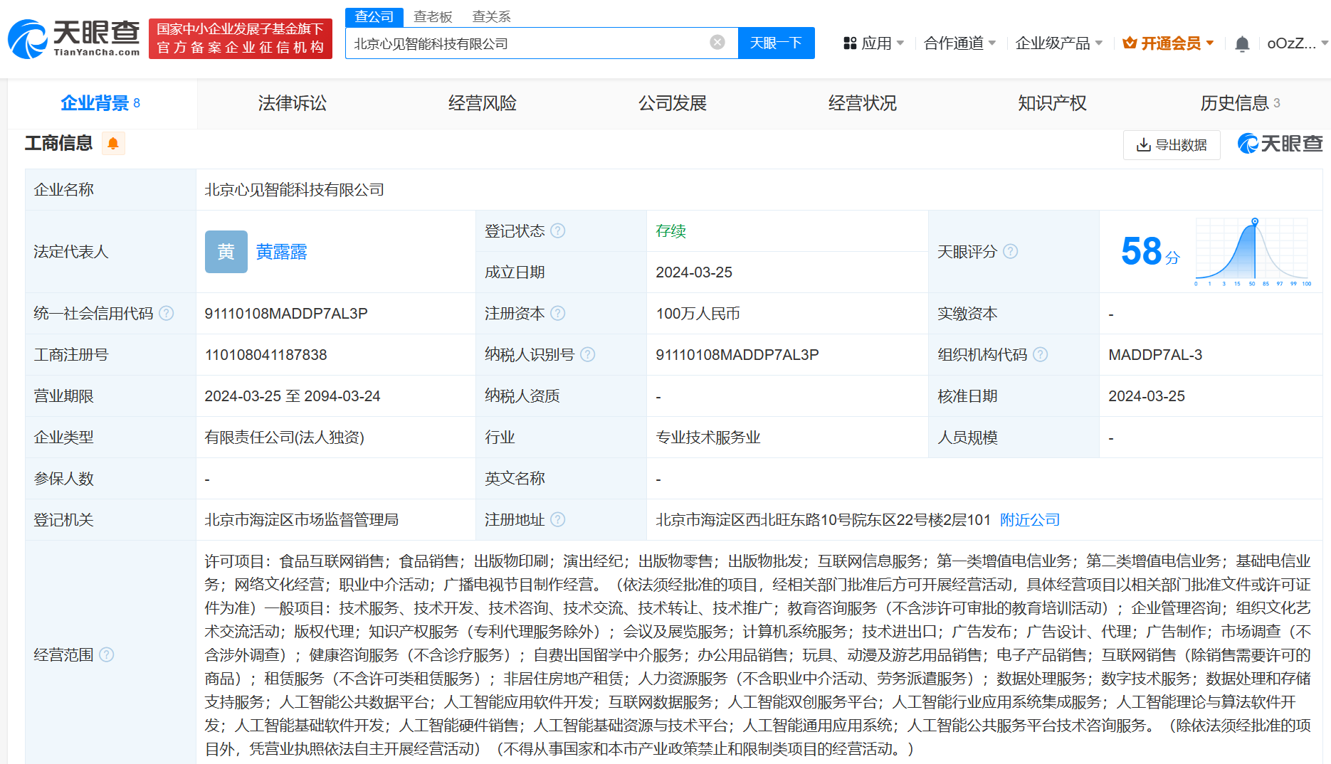 南方财经3月28日电,天眼查App显示,近日,北京心见智能科技有限公司成立,法定代表人为黄露露,注册资本100万人民币,经营范围含食品互联网销售、演出经纪、网络文化经营、人工智能应用软件开发、人工智能双创服务平台、人工智能通用应用系统等。股东信息显示,该公司由高途教育科技集团有限公司全资持股。