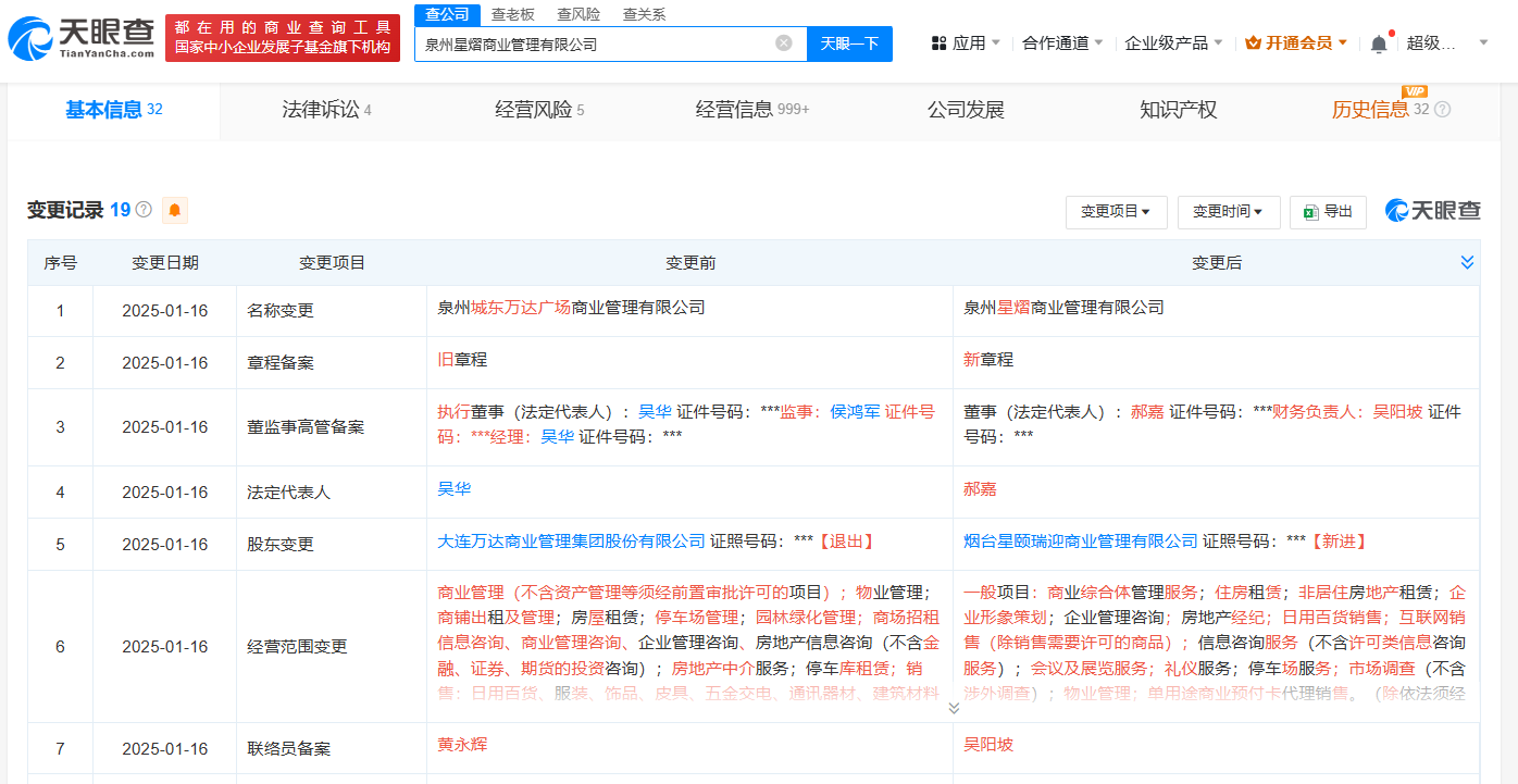 南方财经1月17日电,天眼查App显示,近日,泉州城东万达广场商业管理有限公司发生工商变更,企业名称变更为泉州星熠商业管理有限公司,原股东大连万达商业管理集团股份有限公司退出,新增复星集团旗下烟台星颐瑞迎商业管理有限公司全资持股,同时法定代表人、主要人员均发生变更。泉州星熠商业管理有限公司成立于2017年8月,注册资本100万人民币,经营范围包括商业综合体管理服务、住房租赁、非居住房地产租赁等。值得注意的是,不久前,烟台星颐瑞迎商业管理有限公司刚接盘泉州星耀商业管理有限公司。