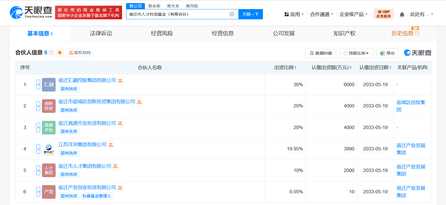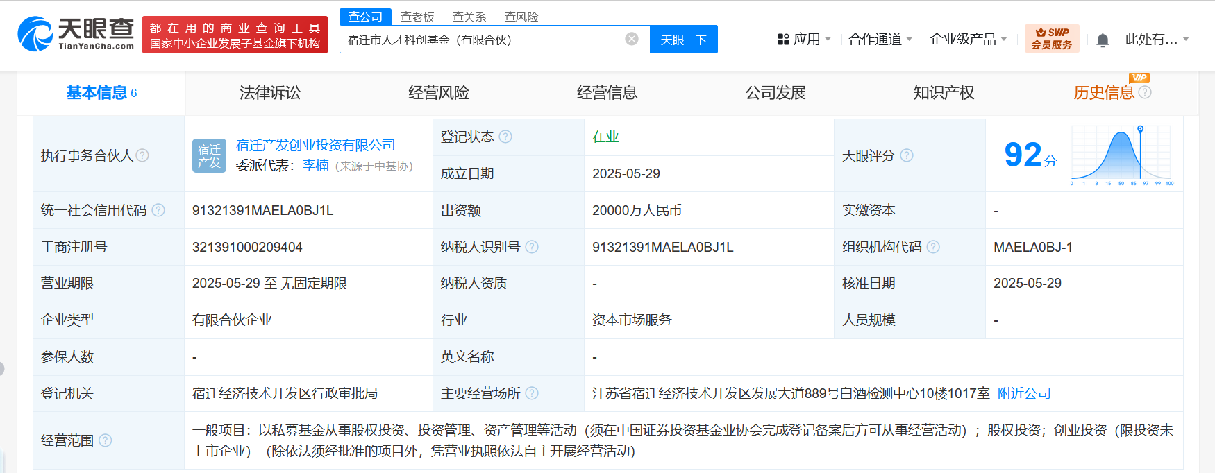 南方财经5月30日电,天眼查App显示,近日,宿迁市人才科创基金(有限合伙)成立,执行事务合伙人为宿迁产发创业投资有限公司,出资额2亿人民币,经营范围为以私募基金从事股权投资、投资管理、资产管理等活动,股权投资,创业投资。合伙人信息显示,该基金由宿迁汇融控股集团有限公司、宿迁市宿城区创新投资集团有限公司、宿迁高源开发投资有限公司、江苏洋河集团有限公司、宿迁市人才集团有限公司、宿迁产发创业投资有限公司共同出资。
