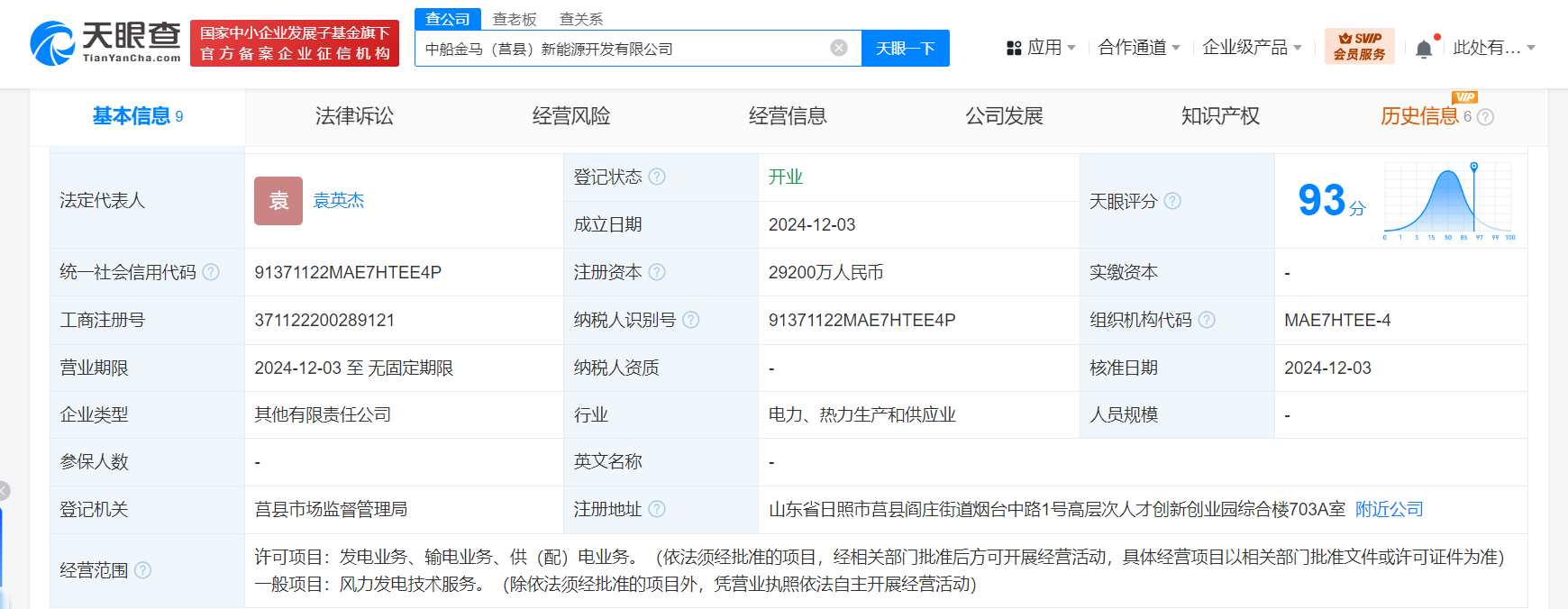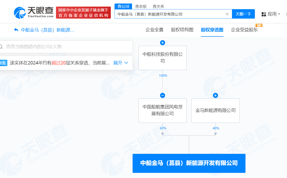 南方财经12月6日电,天眼查App显示,近日,中船金马(莒县)新能源开发有限公司成立,法定代表人为袁英杰,注册资本2.92亿人民币,经营范围含发电业务、输电业务、供(配)电业务,风力发电技术服务。股东信息显示,该公司由中船科技(600072)旗下中国船舶集团风电发展有限公司以及金马新能源有限公司分别持股60%、40%。