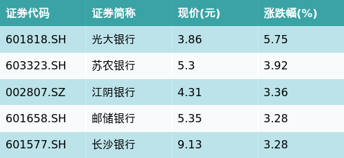 截至午间收盘,银行主题涨跌幅最高的五只股票为:光大银行(601818.SH)、苏农银行(603323.SH)、江阴银行(002807.SZ)、邮储银行(601658.SH)与长沙银行(601577.SH)。详情见下表: