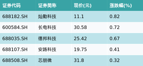截至收盘,国家大基金持股主题涨跌幅最高的五只股票为:灿勤科技(688182.SH)、长电科技(600584.SH)、德邦科技(688035.SH)、安路科技(688107.SH)与芯朋微(688508.SH)。详情见下表: