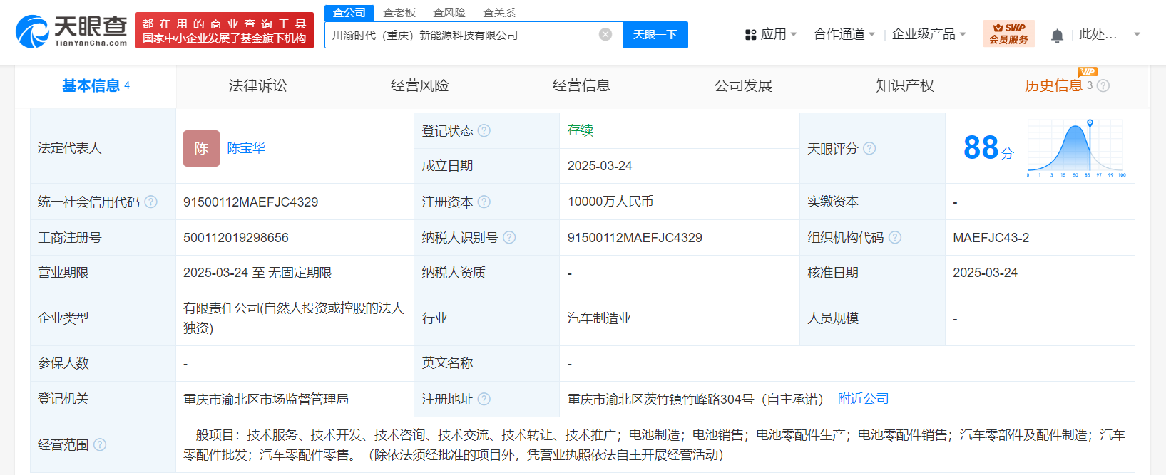 南方财经3月26日电,天眼查App显示,近日,川渝时代(重庆)新能源科技有限公司成立,法定代表人为陈宝华,注册资本1亿人民币,经营范围含电池制造、电池销售、电池零配件生产、电池零配件销售、汽车零部件及配件制造、汽车零配件批发、汽车零配件零售等。股东信息显示,该公司由宁德时代(300750)全资持股。