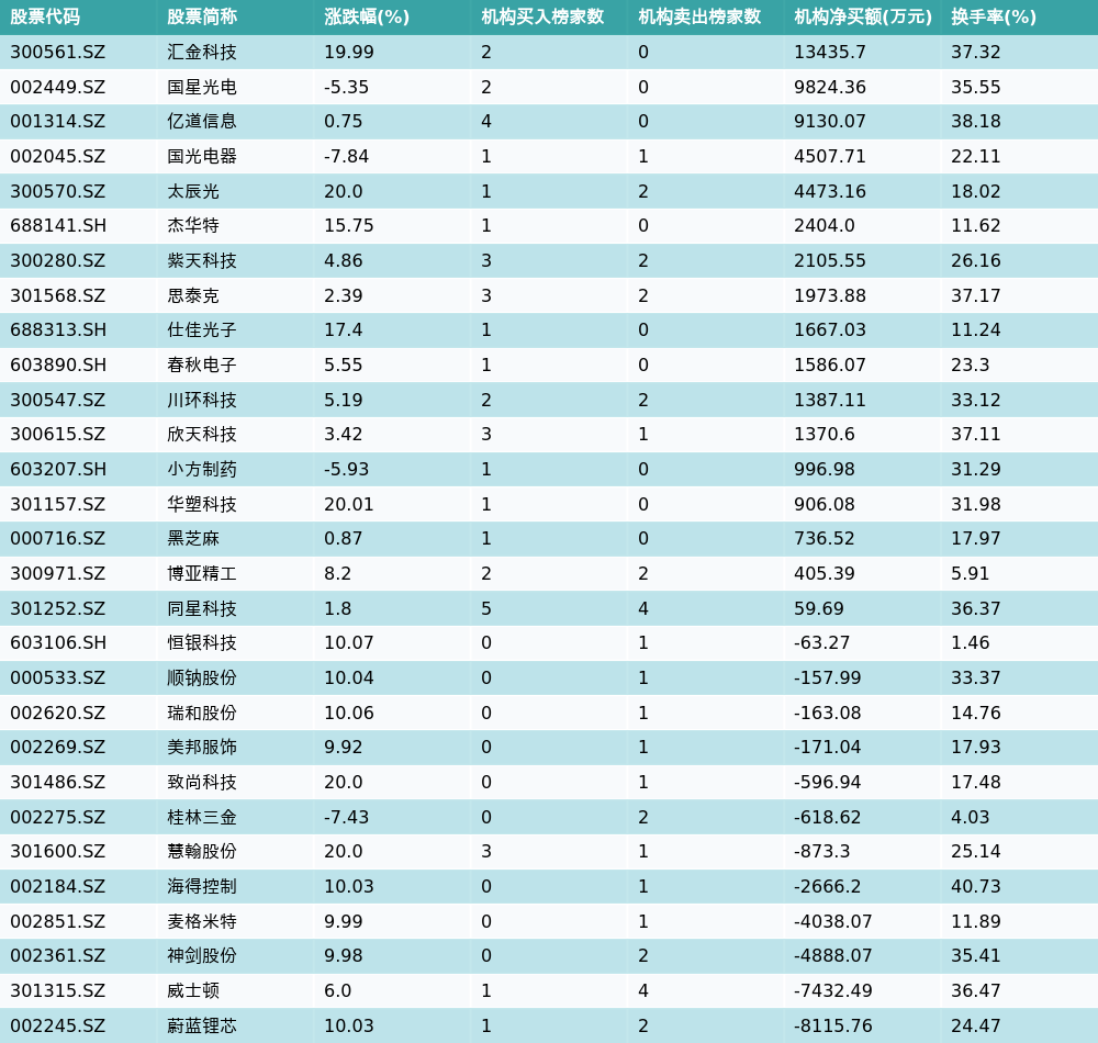 南方财经1月7日电,南财金融终端数据显示,因当日异动登上龙虎榜的个股中,29只沪深A股龙虎榜出现了机构的身影,机构合计净买入27185.07万元,具体来看,机构净买入17只个股,净卖出12只个股。其中,机构净买入前三分别为汇金科技(300561.SZ)、国星光电(002449.SZ)与亿道信息(001314.SZ),详情见下图: