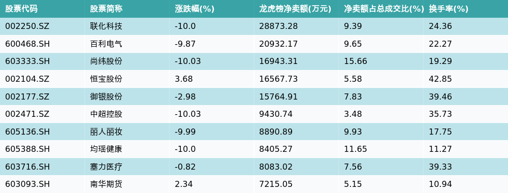 南财智讯6月11日电,南财金融终端数据显示,因当日异动登上龙虎榜的个股中,龙虎榜中资金净流出最多的前三位分别是联化科技(002250.SZ)、百利电气(600468.SH)与尚纬股份(603333.SH)。其中排名第一的联化科技被净卖出2.89亿元,占总成交金额的9.39%。联化科技收盘下跌10.0%,换手率为24.36%。净卖出额前10个股详情见下图: