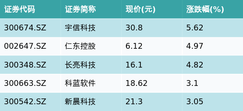 截至收盘,跨境支付(CIPS)主题涨跌幅最高的五只股票为:宇信科技(300674.SZ)、仁东控股(002647.SZ)、长亮科技(300348.SZ)、科蓝软件(300663.SZ)与新晨科技(300542.SZ)。详情见下表:
