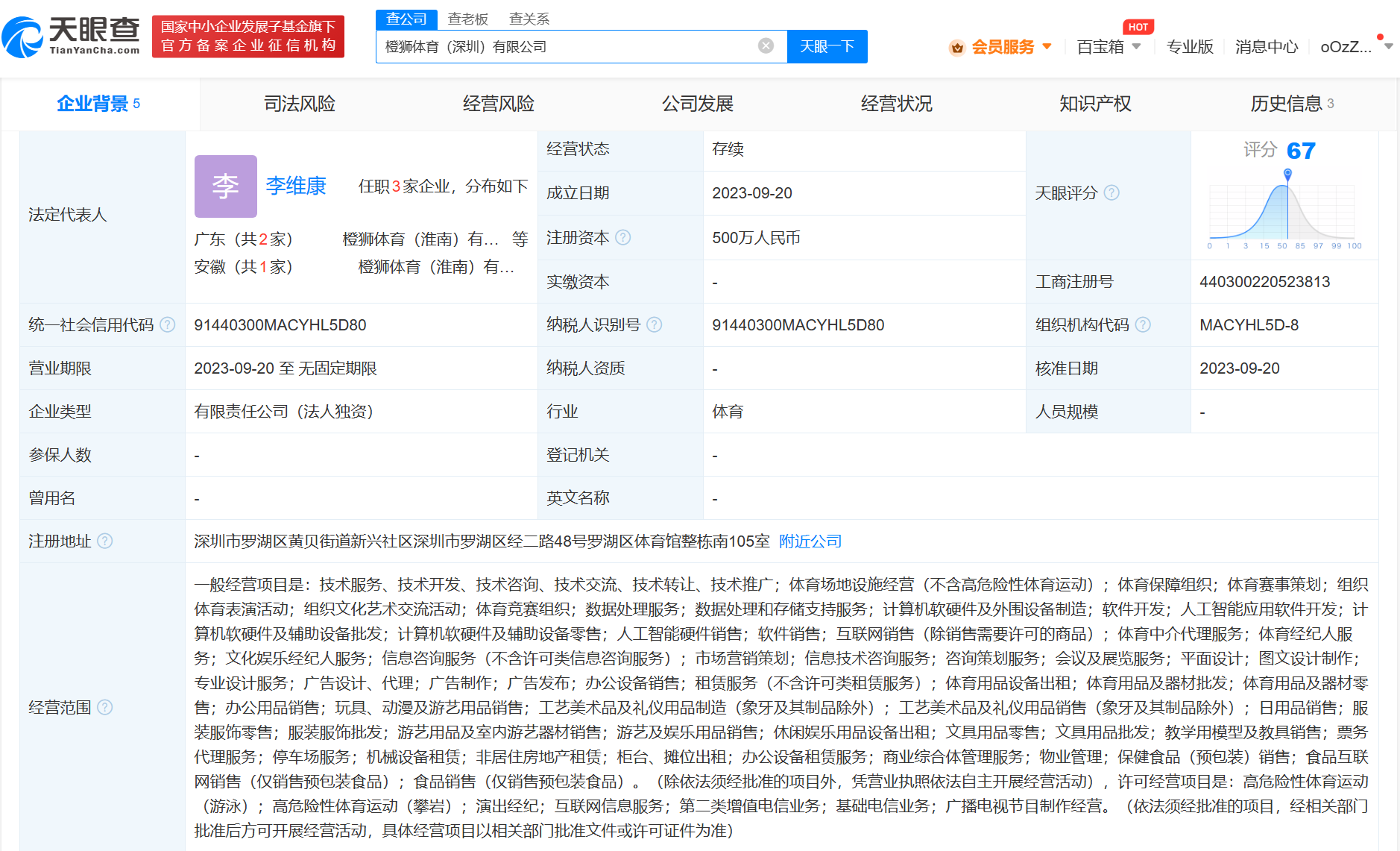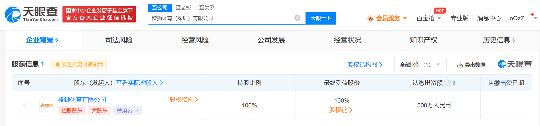 南方财经9月21日电,天眼查App显示,近日,橙狮体育(深圳)有限公司成立,法定代表人为李维康,注册资本500万人民币,经营范围含体育场地设施经营、体育赛事策划、组织体育表演活动、人工智能应用软件开发、人工智能硬件销售等。股东信息显示,该公司由阿里巴巴旗下橙狮体育有限公司全资持股。