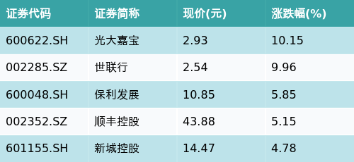 截至午间收盘,REITs主题涨跌幅最高的五只股票为:光大嘉宝(600622.SH)、世联行(002285.SZ)、保利发展(600048.SH)、顺丰控股(002352.SZ)与新城控股(601155.SH)。详情见下表: