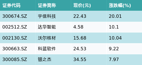 截至午间收盘,互联网金融主题涨跌幅最高的五只股票为:宇信科技(300674.SZ)、达华智能(002512.SZ)、沃尔核材(002130.SZ)、科蓝软件(300663.SZ)与银之杰(300085.SZ)。详情见下表: