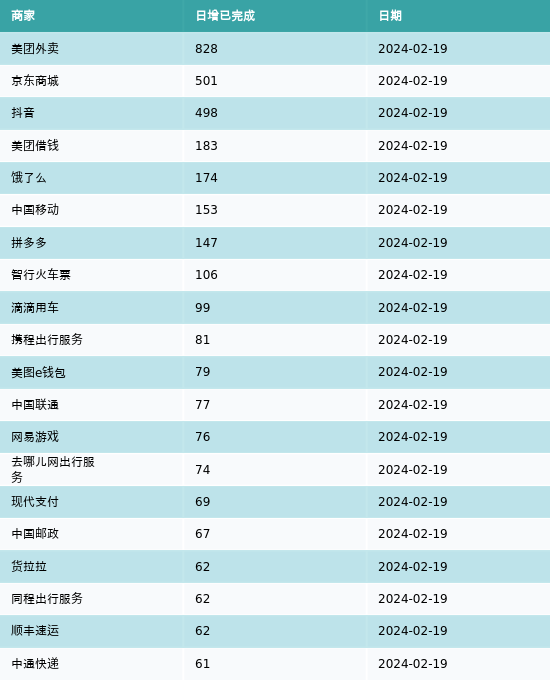 南方财经2月20日电,根据黑猫投诉网站数据显示,2月19日新增投诉完成处理最高前三名的商家分别为:美团外卖、京东商城和抖音,分别增加828起、501起和498起。2月19日新增投诉完成处理前20详情见下表:
