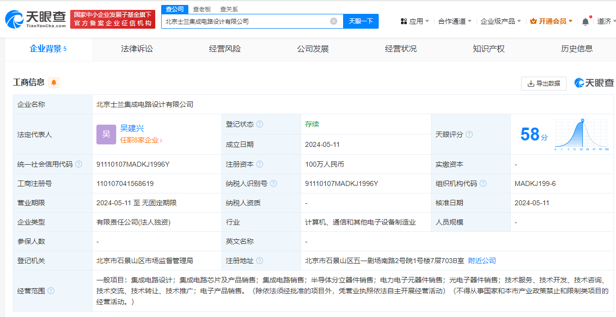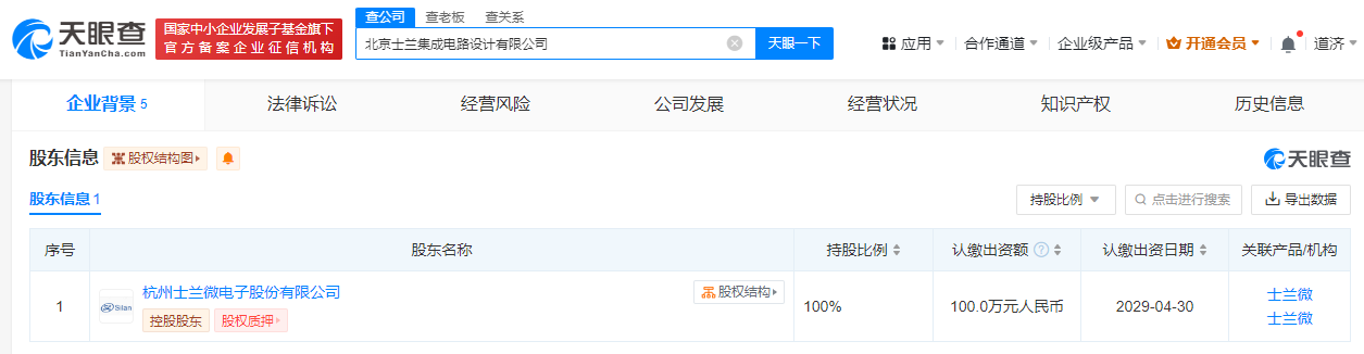 南方财经5月14日电,天眼查App显示,近日,北京士兰集成电路设计有限公司成立,法定代表人为吴建兴,注册资本100万人民币,经营范围含集成电路设计、集成电路芯片及产品销售、集成电路销售、半导体分立器件销售、电力电子元器件销售、光电子器件销售等。股东信息显示,该公司由士兰微(600460)全资持股。