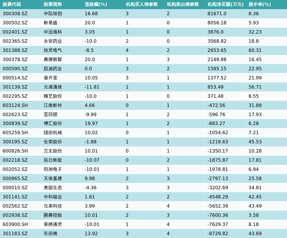 南财智讯7月15日电,南财金融终端数据显示,因当日异动登上龙虎榜的个股中,25只沪深A股龙虎榜出现了机构的身影,机构合计净买入56572.43万元,具体来看,机构净买入10只个股,净卖出15只个股。其中,机构净买入前三分别为中际旭创(300308.SZ)、新易盛(300502.SZ)与中远海科(002401.SZ),详情见下图:机构净卖出的个股中,前三分别为东田微(301183.SZ)、莱绅通灵(603900.SH)与鹏鼎控股(002938.SZ)。