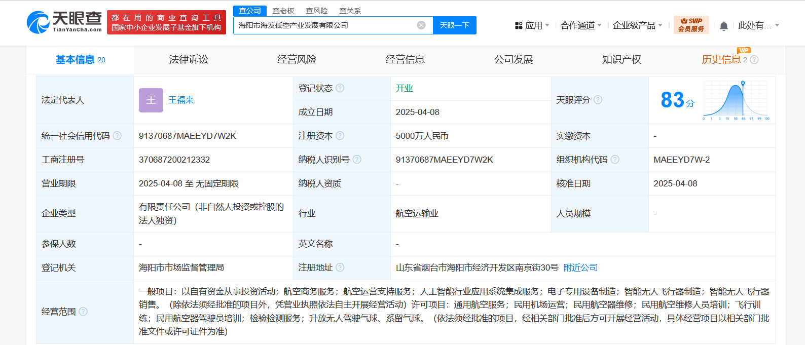 海阳市海发低空产业发展公司成立 注册资本5000万