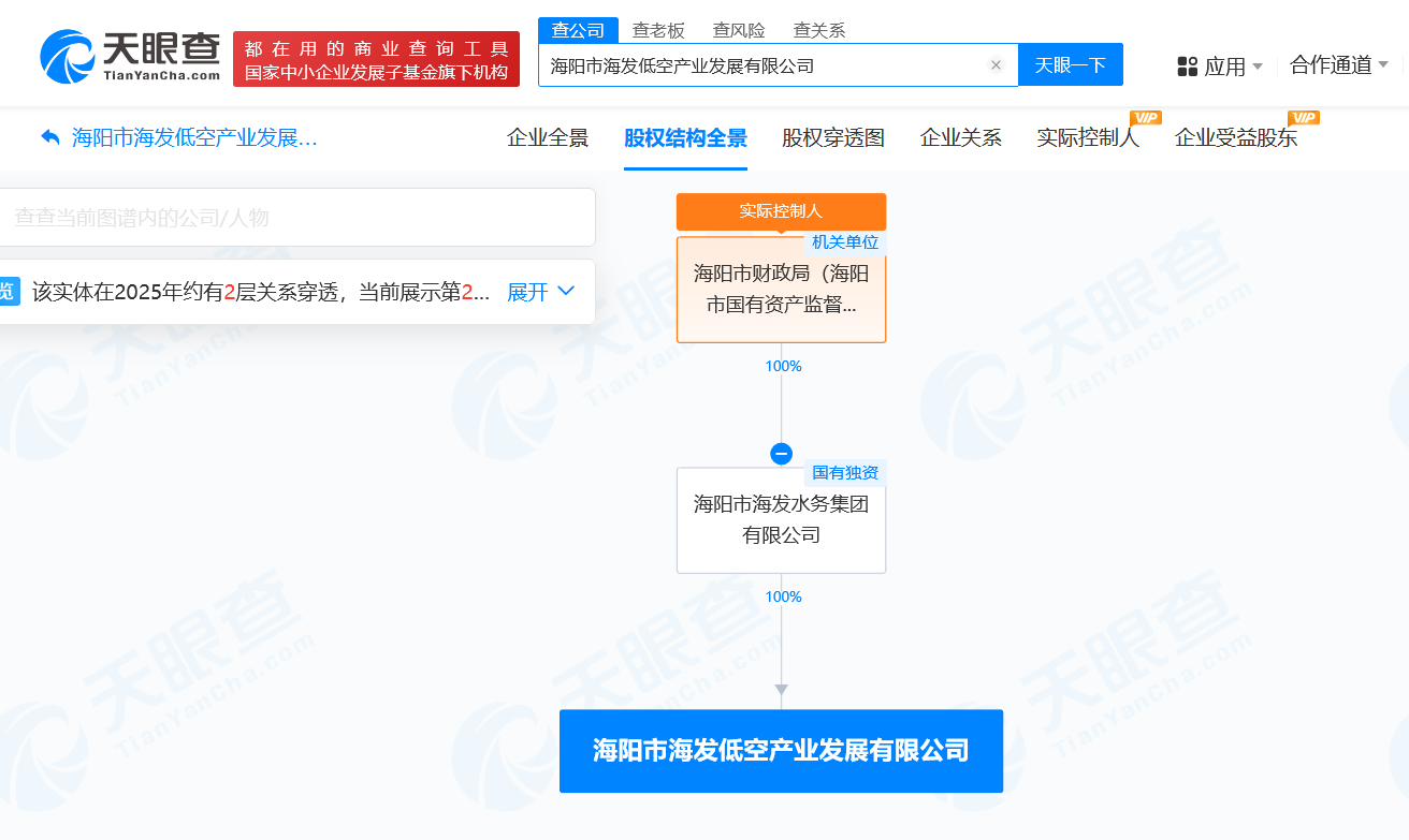 南方财经4月11日电,天眼查App显示,近日,海阳市海发低空产业发展有限公司成立,法定代表人为王福来,注册资本5000万人民币,经营范围含以自有资金从事投资活动、航空商务服务、航空运营支持服务、人工智能行业应用系统集成服务、电子专用设备制造、智能无人飞行器制造、智能无人飞行器销售等。股权全景穿透图显示,该公司由海阳市海发水务集团有限公司全资持股,后者为海阳市财政局(海阳市国有资产监督管理局)全资子公司。
