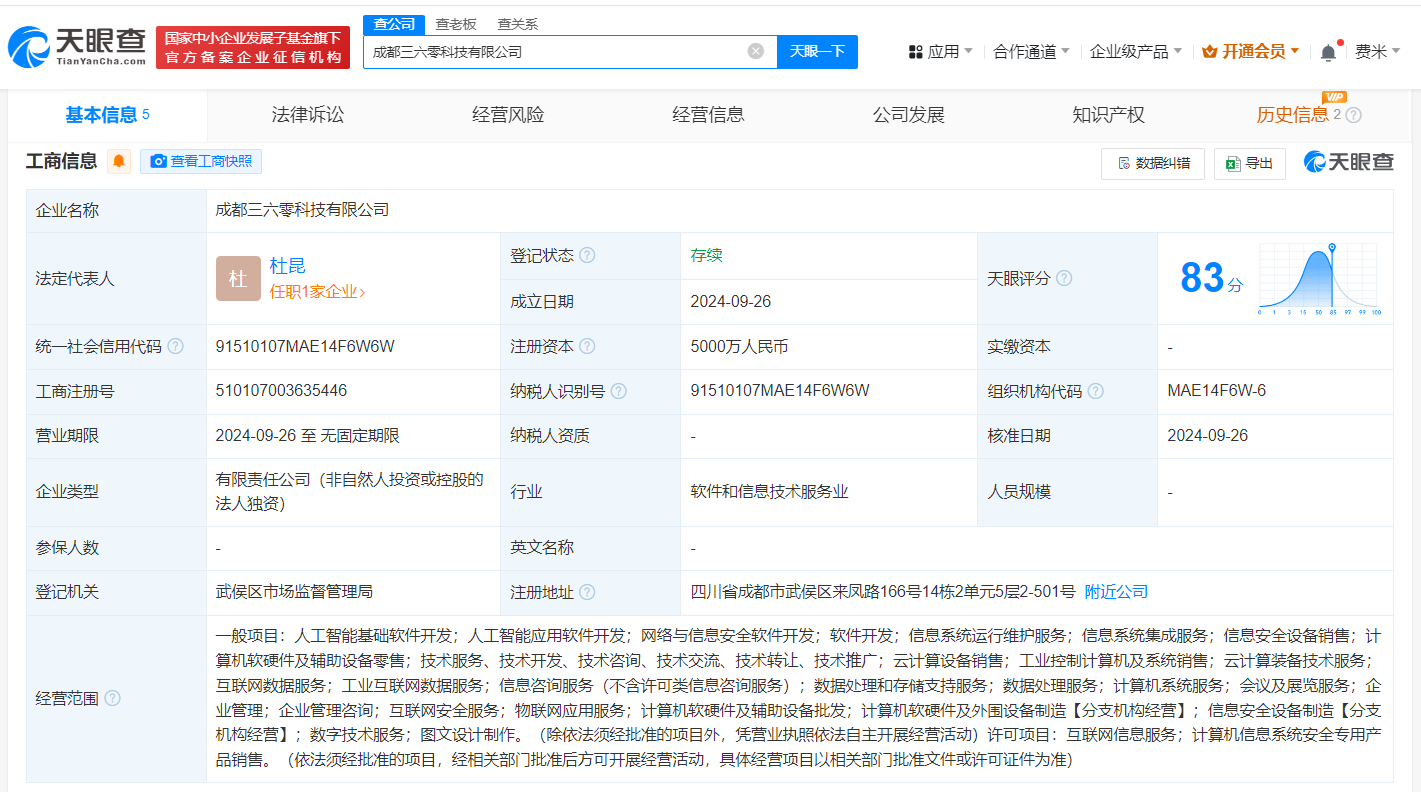 三六零在成都成立新公司 注册资本5000万