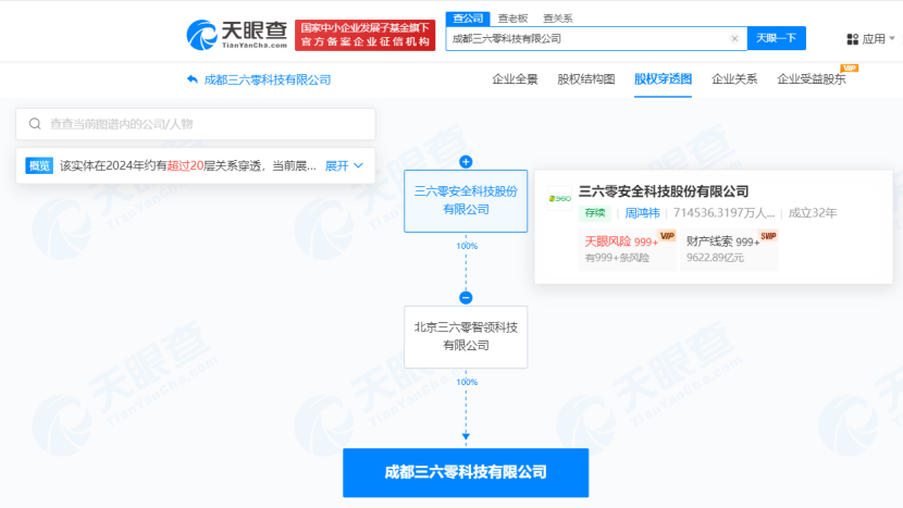 南方财经10月9日电,天眼查App显示,近日,成都三六零科技有限公司成立,法定代表人为杜昆,注册资本5000万人民币,经营范围含人工智能基础软件开发、人工智能应用软件开发、网络与信息安全软件开发、信息系统运行维护服务、信息系统集成服务、计算机软硬件及辅助设备零售等。股权穿透图显示,该公司由三六零(601360)旗下北京三六零智领科技有限公司全资持股。
