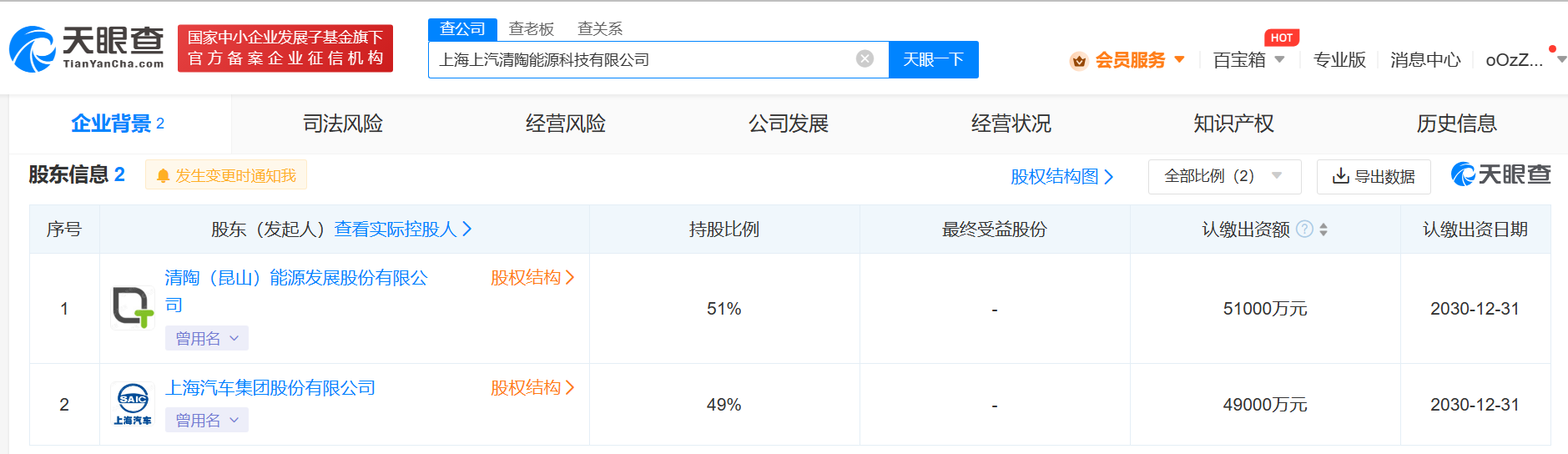 南方财经11月3日电,天眼查App显示,近日,上海上汽清陶能源科技有限公司成立,法定代表人为李峥,注册资本10亿人民币,经营范围含新兴能源技术研发、汽车零部件研发、电池销售、新能源汽车换电设施销售、大数据服务等。股东信息显示,该公司由清陶(昆山)能源发展股份有限公司、上汽集团(600104)分别持股51%、49%。