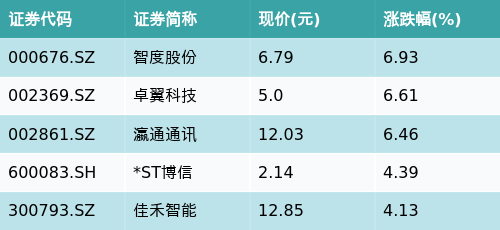 截至收盘,智能音箱主题涨跌幅最高的五只股票为:智度股份(000676.SZ)、卓翼科技(002369.SZ)、瀛通通讯(002861.SZ)、*ST博信(600083.SH)与佳禾智能(300793.SZ)。详情见下表:
