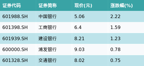 截至午间收盘,跨境支付(CIPS)主题涨跌幅最高的五只股票为:中国银行(601988.SH)、工商银行(601398.SH)、建设银行(601939.SH)、浦发银行(600000.SH)与交通银行(601328.SH)。详情见下表: