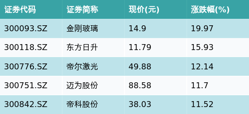 截至午间收盘,HJT电池主题涨跌幅最高的五只股票为:金刚玻璃(300093.SZ)、东方日升(300118.SZ)、帝尔激光(300776.SZ)、迈为股份(300751.SZ)与帝科股份(300842.SZ)。详情见下表:
