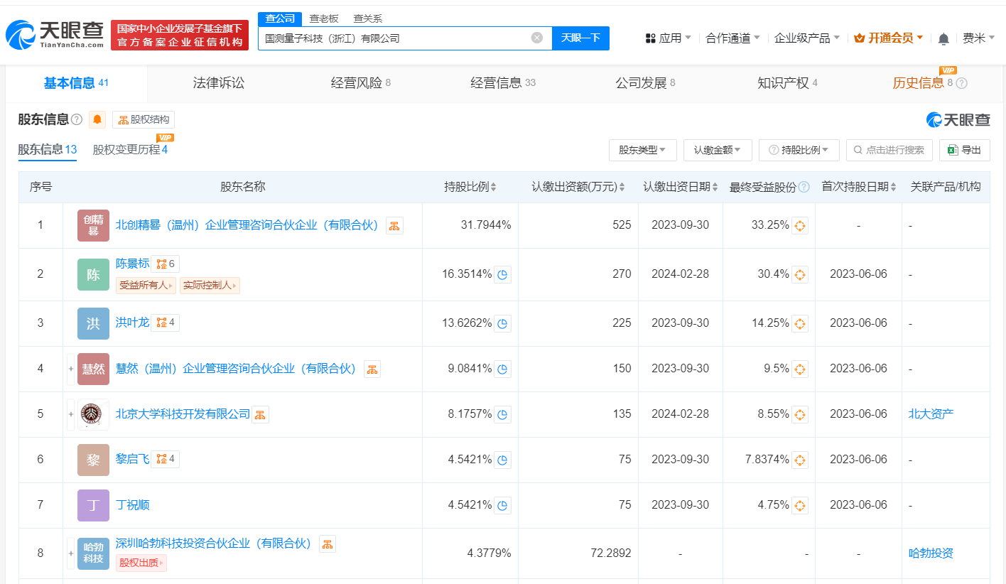 南方财经9月4日电,天眼查App显示,近日,国测量子科技(浙江)有限公司发生工商变更,新增华为旗下深圳哈勃科技投资合伙企业(有限合伙)为股东,公司注册资本由约1578.9万人民币增至约1651.2万人民币。国测量子科技(浙江)有限公司成立于2023年6月,法定代表人为陈景标,经营范围含量子计算技术服务、电子测量仪器销售、实验分析仪器销售、钟表与计时仪器销售、电子元器件零售等,现由北创精晷(温州)企业管理咨询合伙企业(有限合伙)、陈景标、北京大学科技开发有限公司等共同持股。公开资料显示,国测量子是北京大学在量子精密测量领域发起设立的产业化公司。