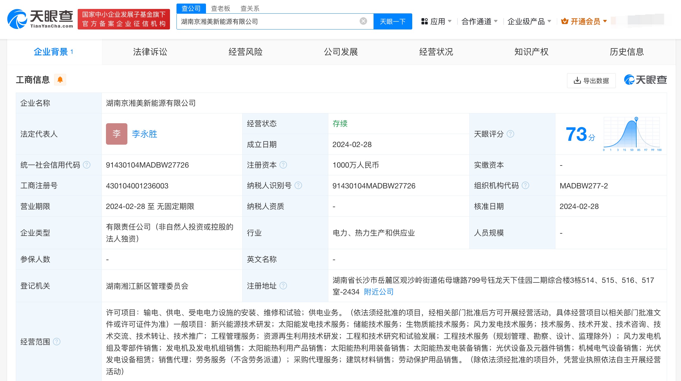 南方财经3月5日电,天眼查App显示,近日,湖南京湘美新能源有限公司成立,法定代表人为李永胜,注册资本1000万人民币,经营范围含新兴能源技术研发、太阳能发电技术服务、储能技术服务、生物质能技术服务、光伏设备及元器件销售、机械电气设备销售等。股东信息显示,该公司由国家电投集团(北京)新能源投资有限公司全资持股。