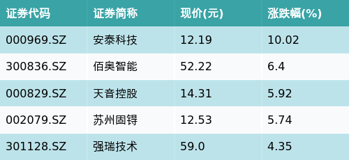 截至收盘,苹果概念主题涨跌幅最高的五只股票为:安泰科技(000969.SZ)、佰奥智能(300836.SZ)、天音控股(000829.SZ)、苏州固锝(002079.SZ)与强瑞技术(301128.SZ)。详情见下表: