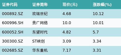 截至收盘,文化传媒主题涨跌幅最高的五只股票为:欢瑞世纪(000892.SZ)、贵广网络(600996.SH)、东望时代(600052.SH)、ST峡创(300300.SZ)与华东重机(002685.SZ)。详情见下表: