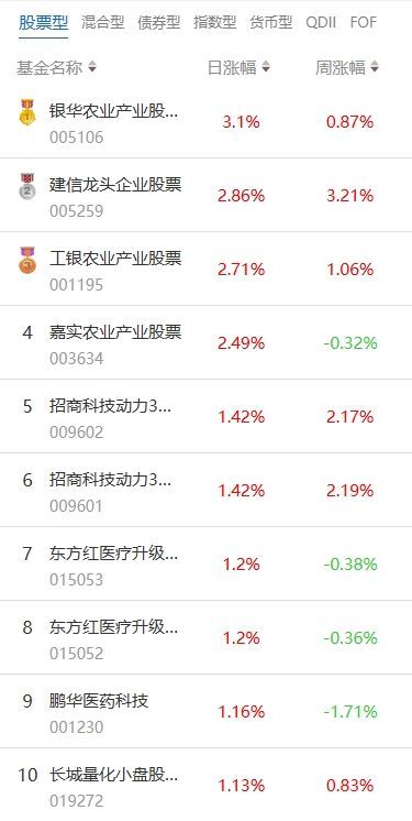 南方财经12月30日电,根据南财基金通数据:2024年12月27日当日收益靠前的股票型基金包括:银华农业产业股票型发起式证券投资基金(005106,日收益3.1%);建信龙头企业股票型证券投资基金(005259,日收益2.86%);工银瑞信农业产业股票型证券投资基金(001195,日收益2.71%)等。收益较低的股票型基金包括:国联安科技动力股票型证券投资基金(001956,日收益-2.56%);嘉实绿色主题股票型发起式证券投资基金(017744,日收益-2.22%);宝盈国家安全战略沪港深股票型证券投资基金(001877,日收益-2.12%)等。