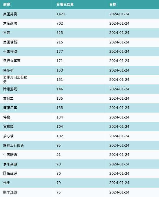 南方财经1月25日电,根据黑猫投诉网站数据显示,1月24日新增投诉回复最高前三名的商家分别为:美团外卖、京东商城和抖音,分别增加1421起、702起和525起。1月24日新增投诉回复前20详情见下表: