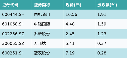 截至收盘,盐湖提锂主题涨跌幅最高的五只股票为:国机通用(600444.SH)、中铝国际(601068.SH)、兆新股份(002256.SZ)、万邦达(300055.SZ)与冠农股份(600251.SH)。详情见下表: