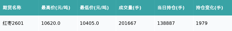 南财智讯7月10日电,南财金融终端盘后期货数据显示,郑州商品交易所的红枣主力合约收涨2.12%,收盘报10580.0元/吨,日内资金流入3794.27万元。其他相关指标见下表: