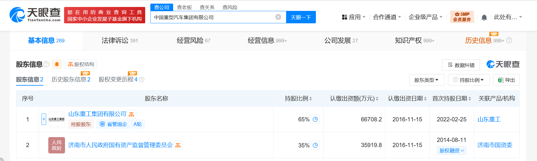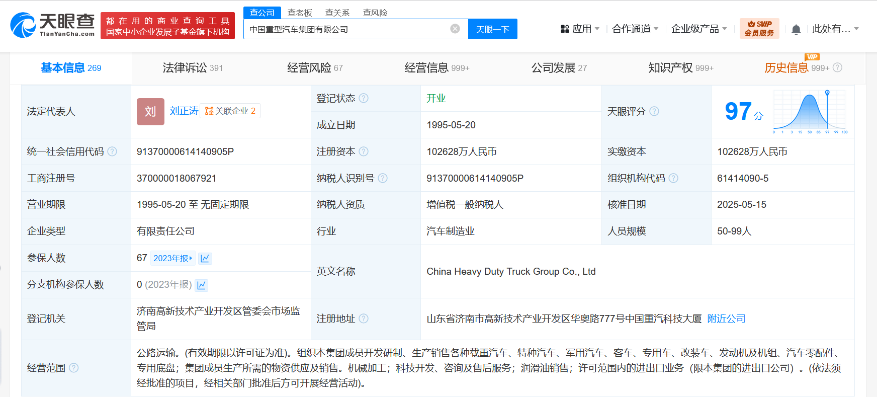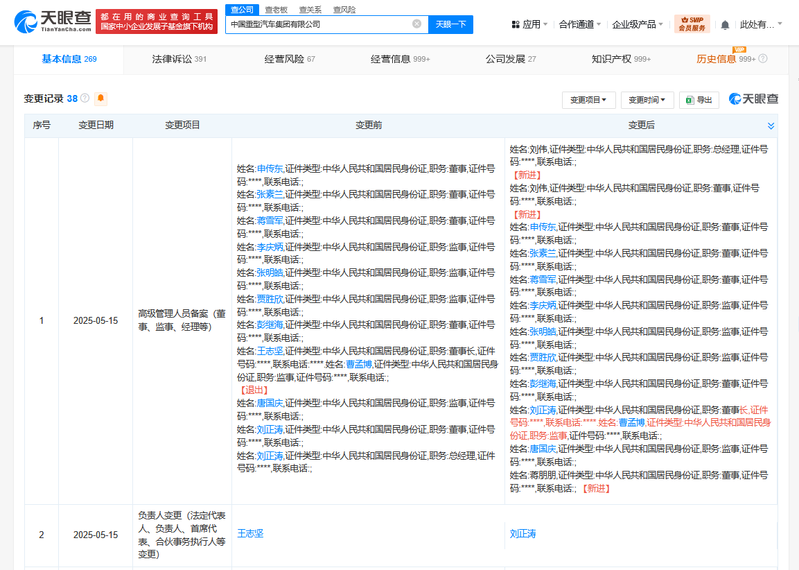 南方财经5月20日电,天眼查App显示,近日,中国重型汽车集团有限公司发生工商变更,王志坚卸任法定代表人、董事长,由刘正涛接任,同时,新增刘伟为总经理、董事,新增蒋朋朋为董事。中国重型汽车集团有限公司成立于1995年5月,注册资本约10.26亿人民币,经营范围含公路运输,组织本集团成员开发研制、生产销售各种载重汽车、特种汽车、军用汽车、客车、专用车、改装车、发动机及机组、汽车零配件、专用底盘,集团成员生产所需的物资供应及销售等。股东信息显示,该公司由山东重工集团有限公司、济南市人民政府国有资产监督管理委员会分别持股65%、35%。据媒体报道,此前,中国重汽发布一则执行董事、总裁及授权代表变动及董事委员会人事变动公告,刘正涛已获委任为中国重汽(香港)有限公司总裁及战略及投资委员会成员。中国重汽集团官方网站显示,刘正涛已任中国重汽集团党委书记、董事长。刘伟任中国重汽集团党委副书记、董事、总经理。