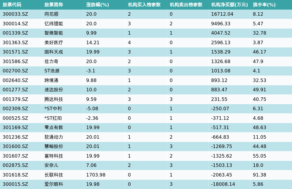 南方财经9月30日电,南财金融终端数据显示,因当日异动登上龙虎榜的个股中,19只沪深A股龙虎榜出现了机构的身影,机构合计净买入12764.79万元,具体来看,机构净买入10只个股,净卖出9只个股。其中,机构净买入前三分别为同花顺(300033.SZ)、亿纬锂能(300014.SZ)与智微智能(001339.SZ),详情见下图: