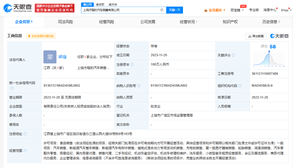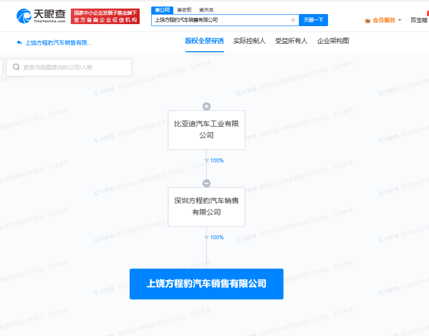 南方财经11月22日电,天眼查App显示,近日,上饶方程豹汽车销售有限公司成立,法定代表人为梁锋,注册资本100万人民币,经营范围包括新能源汽车整车销售、新能源汽车电附件销售、插电式混合动力专用发动机销售、充电桩销售等。股权全景穿透图显示,该公司由深圳方程豹汽车销售有限公司全资持股,后者为比亚迪汽车工业有限公司全资子公司。