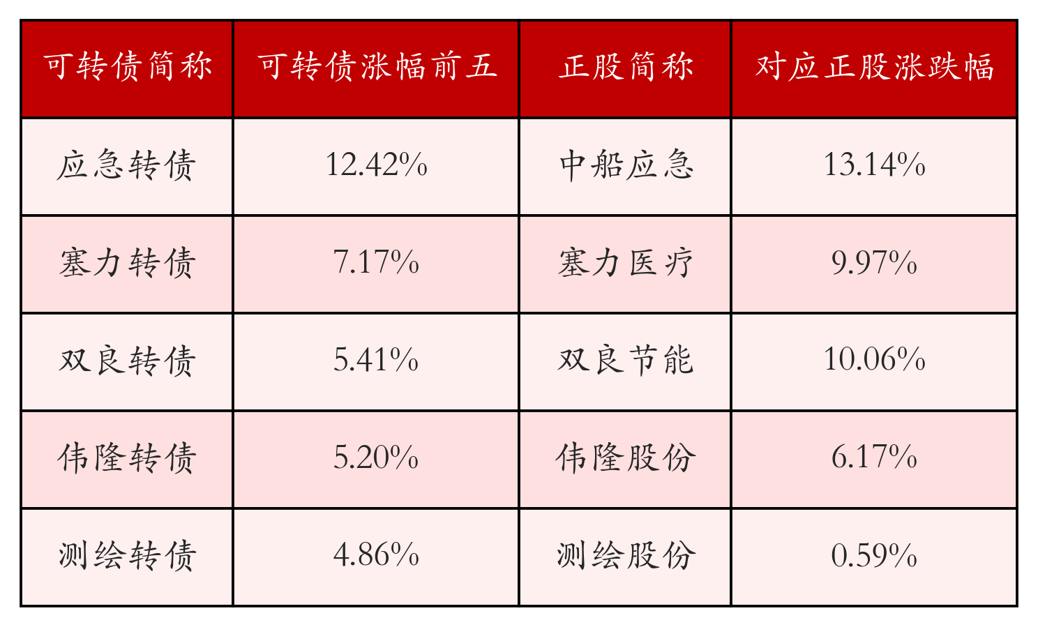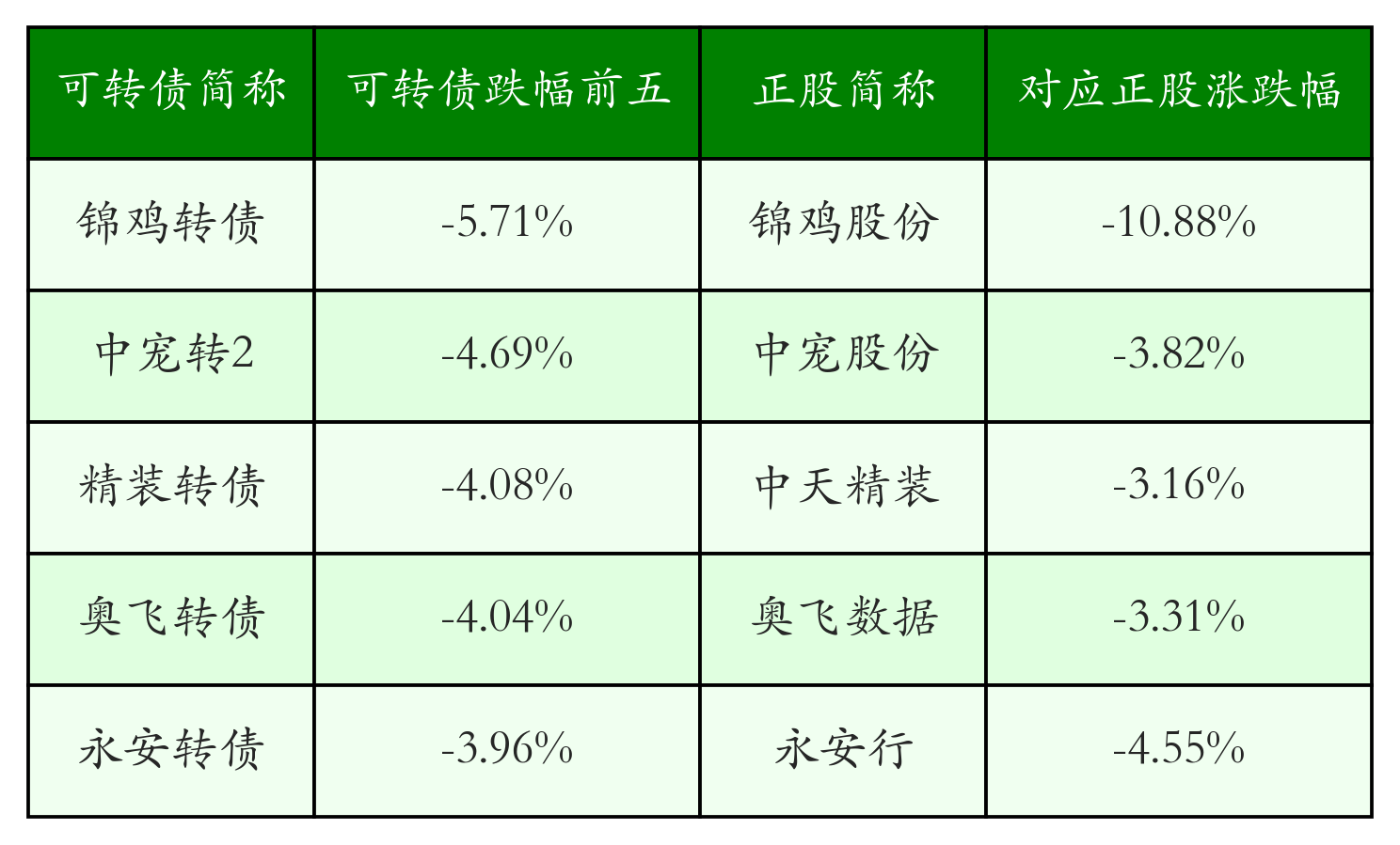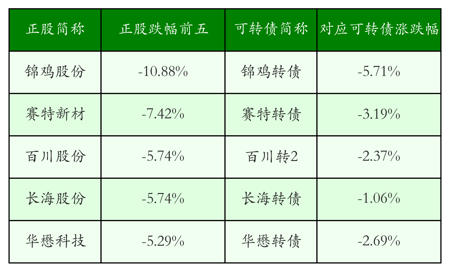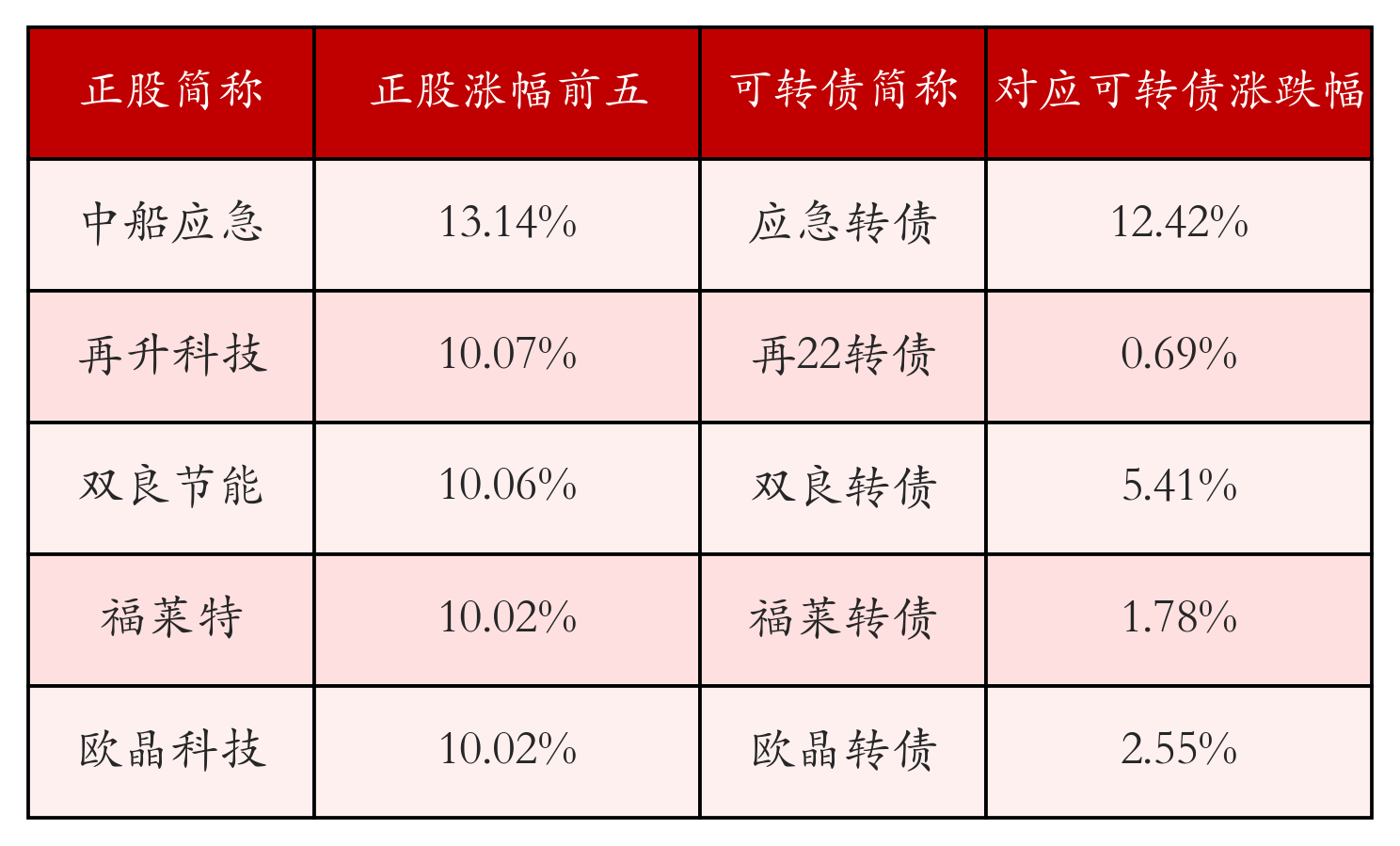 南财智讯7月2日电,南财金融终端盘后数据显示,债市方面,中证转债指数收跌0.32%,报444.34,成交额为655.32亿元。可转债方面,今日共成交466只可转债,其中84只收涨,1只收平,381只收跌。具体来看,10只可转债涨幅超过2%。其中应急转债(123048)涨12.42%,塞力转债(113601)涨7.17%,双良转债(110095)涨5.41%。今日有41只可转债跌幅超2%,锦鸡转债(123129)跌5.71%,中宠转2(127076)跌4.69%,精装转债(127055)跌4.08%。存在交易量的可转债所对应的正股中,201只收涨,13只收平,252只收跌。具体来看,16只可转债对应正股涨幅超过5%,其中,再升科技(603601)涨停,收涨10.07%;双良节能(600481)涨停,收涨10.06%。同时所对应的可转债:再22转债(113657)同涨0.69%;双良转债(110095)同涨5.41%。今日有5只可转债对应正股跌幅超过5%,没有正股跌停。