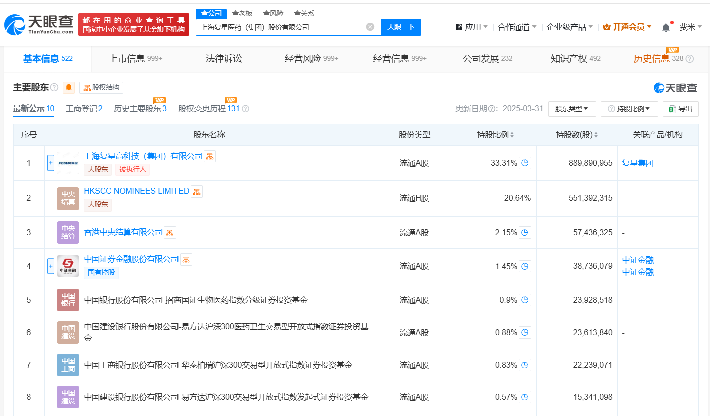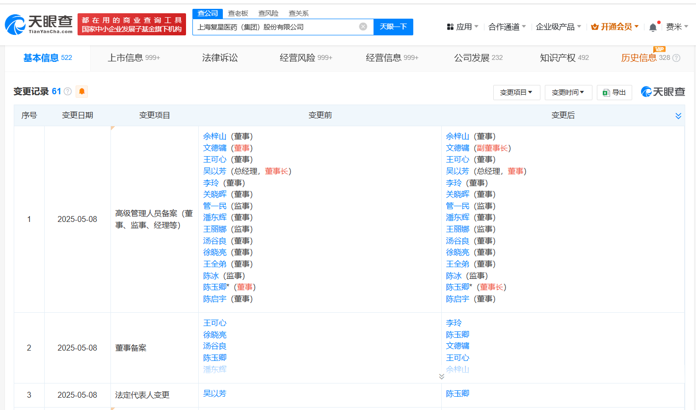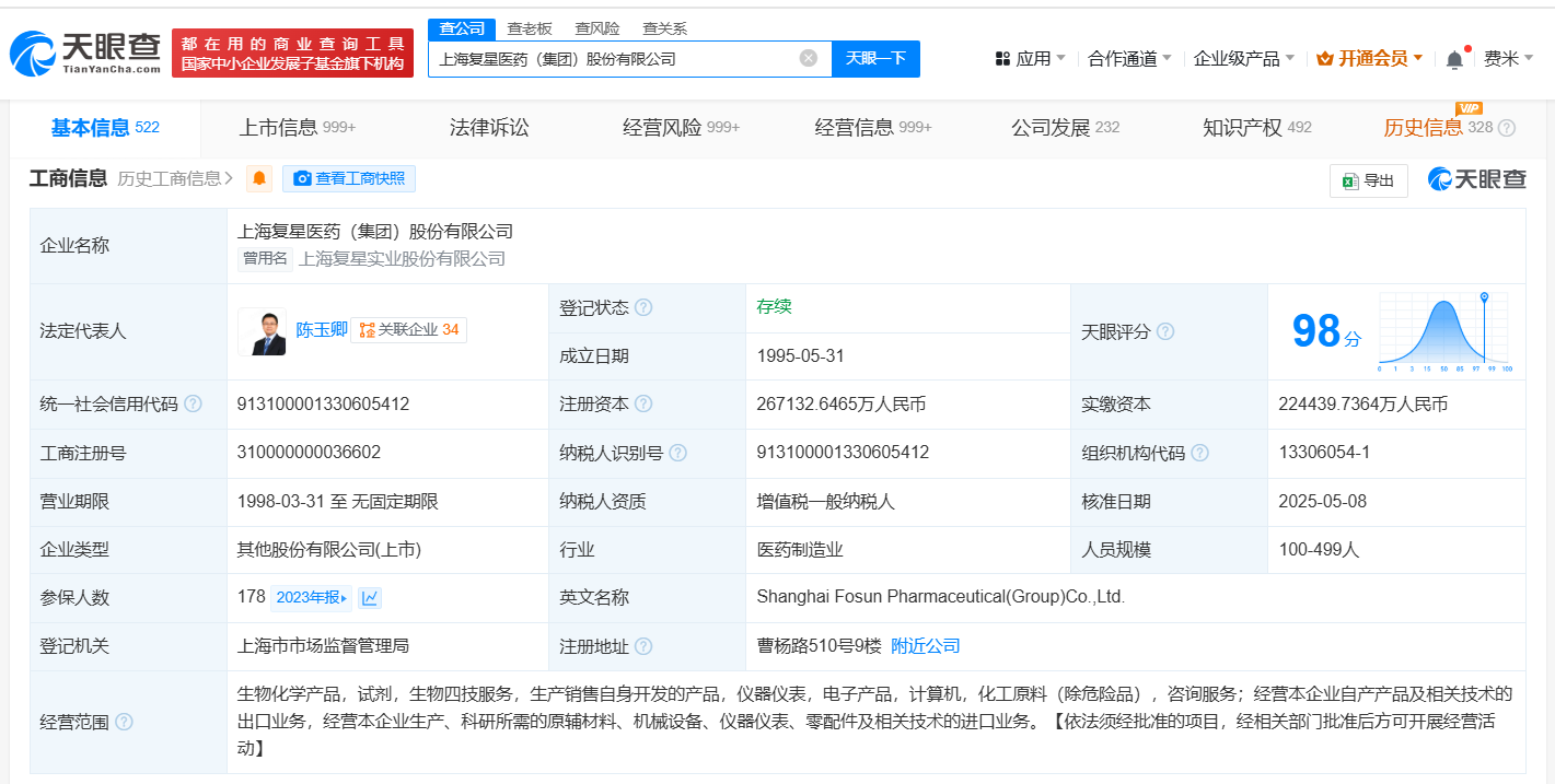 南方财经5月12日电,天眼查App显示,近日,复星医药(600196)发生工商变更,吴以芳卸任法定代表人、董事长,由陈玉卿接任,同时部分高管发生变更。上海复星医药(集团)股份有限公司成立于1995年5月,注册资本约26.7亿人民币,经营范围包括经营本企业自产产品及相关技术的出口业务,经营本企业生产、科研所需的原辅材料、机械设备、仪器仪表、零配件及相关技术的进口业务等,由上海复星高科技(集团)有限公司、HKSCCNOMINEESLIMITED、香港中央结算有限公司等共同持股。据媒体此前报道,复星医药发布公告称,吴以芳不再担任复星医药执行董事、董事长职务,改任复星医药非执行董事,陈玉卿担任复星医药董事长、执行董事。