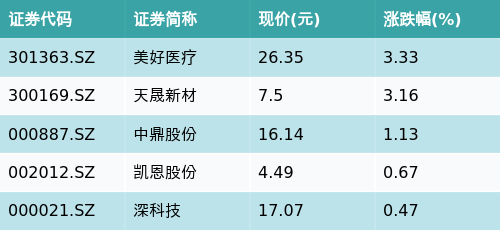 截至收盘,呼吸机主题涨跌幅最高的五只股票为:美好医疗(301363.SZ)、天晟新材(300169.SZ)、中鼎股份(000887.SZ)、凯恩股份(002012.SZ)与深科技(000021.SZ)。详情见下表: