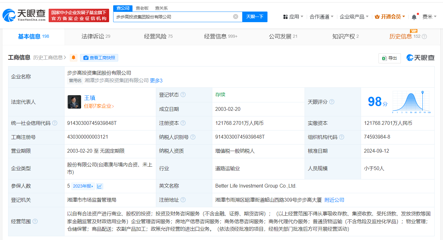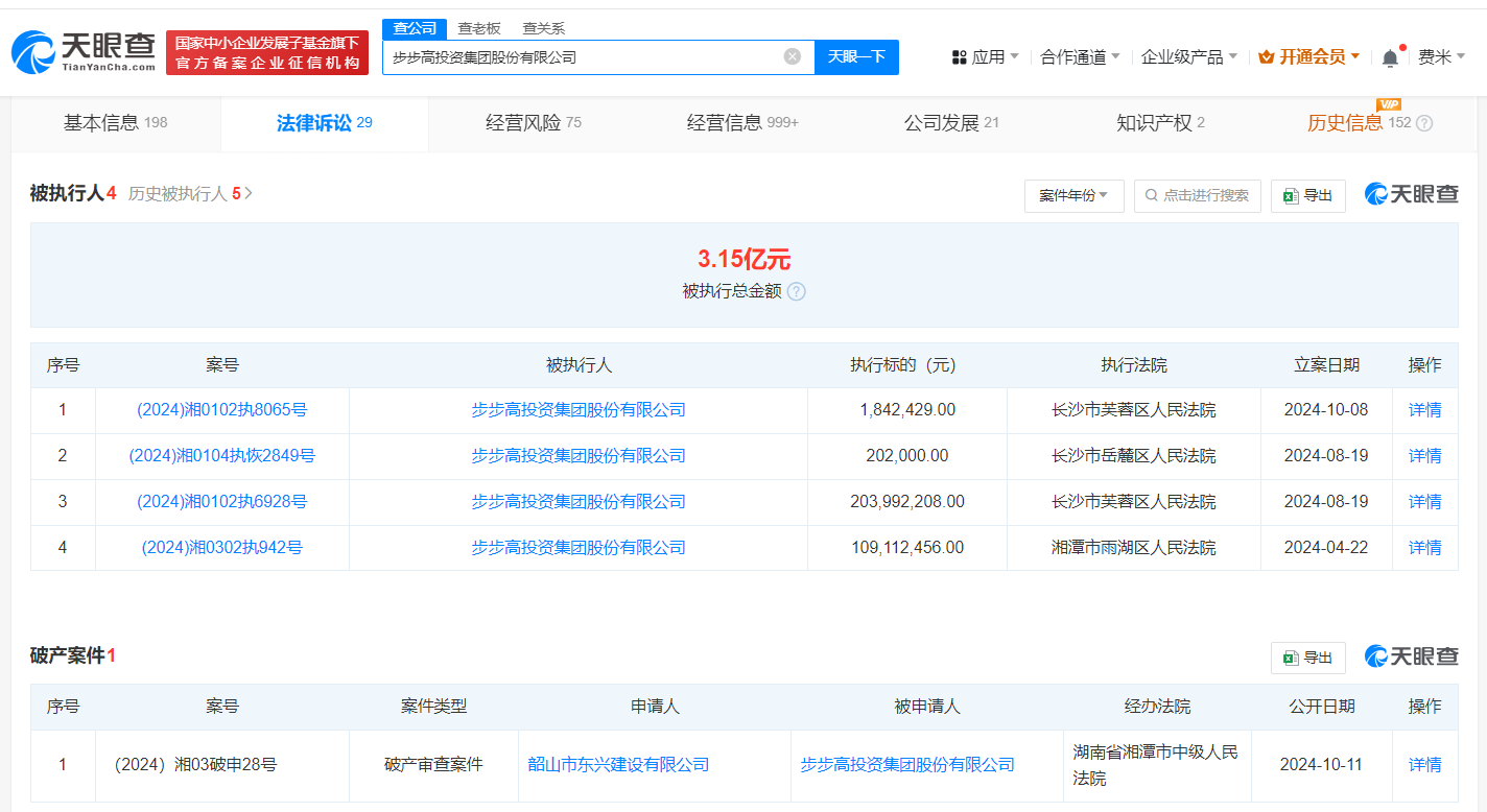 南方财经10月11日电,天眼查法律诉讼信息显示,10月11日,*ST步高(002251)母公司步步高投资集团股份有限公司新增一则破产审查案件,申请人为韶山市东兴建设有限公司,经办法院为湖南省湘潭市中级人民法院。步步高投资集团股份有限公司成立于2003年2月,法定代表人为王填,注册资本约12.2亿人民币,经营范围含企业管理咨询服务、房地产信息咨询服务、商务信息咨询服务、商务代理代办服务、物业管理、仓储保管等,由王填、张海霞、联志投资有限公司等共同持股。天眼风险信息显示,该公司现存4条被执行人信息,被执行总金额超3亿元。