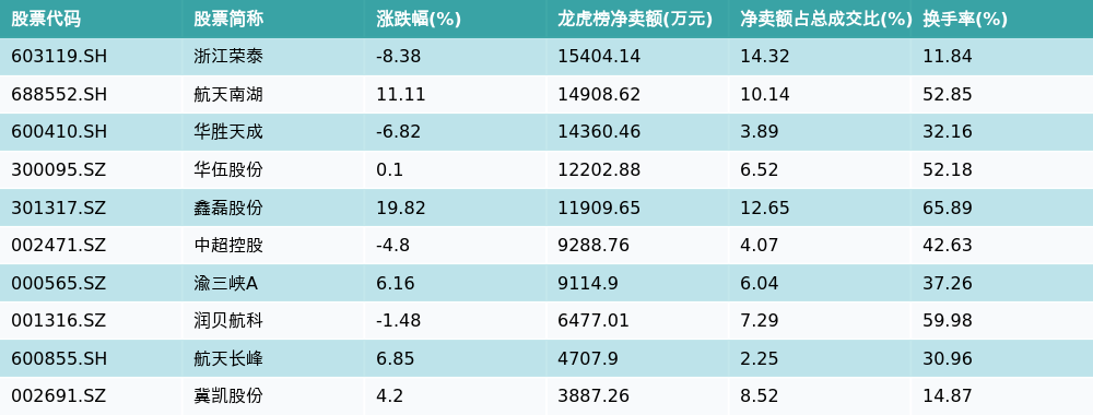 南财智讯5月9日电,南财金融终端数据显示,因当日异动登上龙虎榜的个股中,龙虎榜中资金净流出最多的前三位分别是浙江荣泰(603119.SH)、航天南湖(688552.SH)与华胜天成(600410.SH)。其中排名第一的浙江荣泰被净卖出1.54亿元,占总成交金额的14.32%。浙江荣泰收盘下跌8.38%,换手率为11.84%。净卖出额前10个股详情见下图: