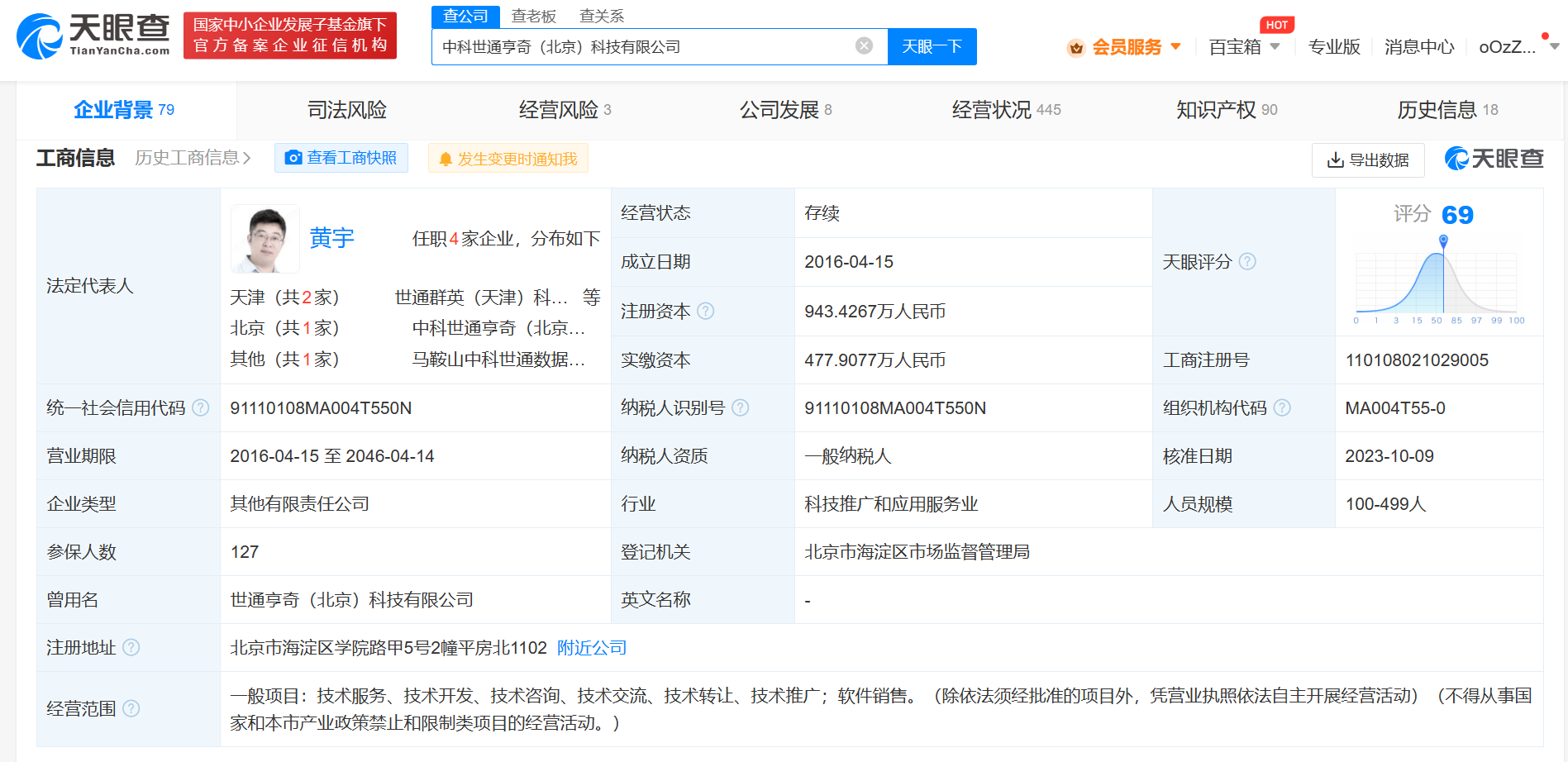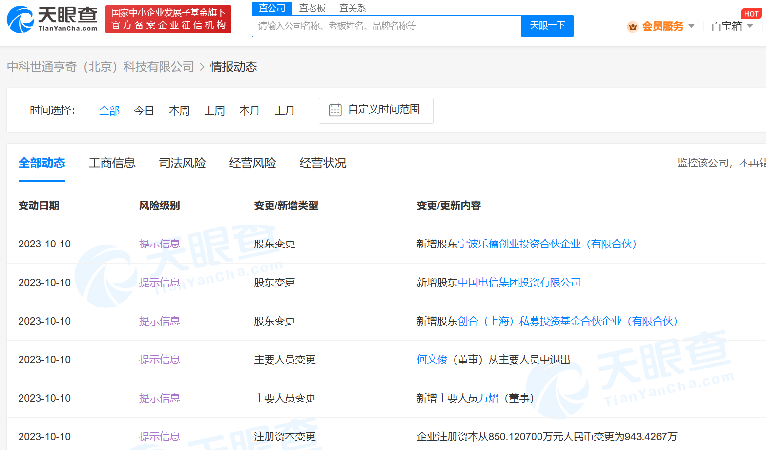 南方财经10月11日电,天眼查App显示,近日,中科世通亨奇(北京)科技有限公司发生工商变更,新增中国电信集团投资有限公司、创合(上海)私募投资基金合伙企业(有限合伙)等为股东,同时公司注册资本由约850.12万人民币增至约943.43万人民币。中科世通亨奇(北京)科技有限公司成立于2016年4月,法定代表人为黄宇,经营范围为技术服务、技术开发、技术咨询、技术交流、技术转让、技术推广,软件销售。据官网介绍,中科世通亨奇是一家数据智能产品服务与解决方案供应商。