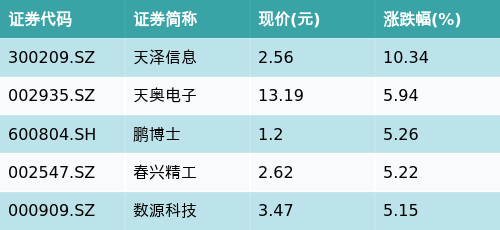 截至收盘,5G主题涨跌幅最高的五只股票为:天泽信息(300209.SZ)、天奥电子(002935.SZ)、鹏博士(600804.SH)、春兴精工(002547.SZ)与数源科技(000909.SZ)。详情见下表: