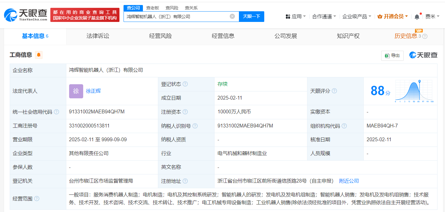 南方财经2月13日电,天眼查App显示,近日,鸿辉智能机器人(浙江)有限公司成立,法定代表人为徐正辉,注册资本1亿人民币,经营范围含服务消费机器人制造、电机制造、电机及其控制系统研发、智能机器人的研发、发电机及发电机组制造、智能机器人销售等,由信质集团(002664)、沿海鼎信(上海)企业管理合伙企业(有限合伙)分别持股90%、10%。