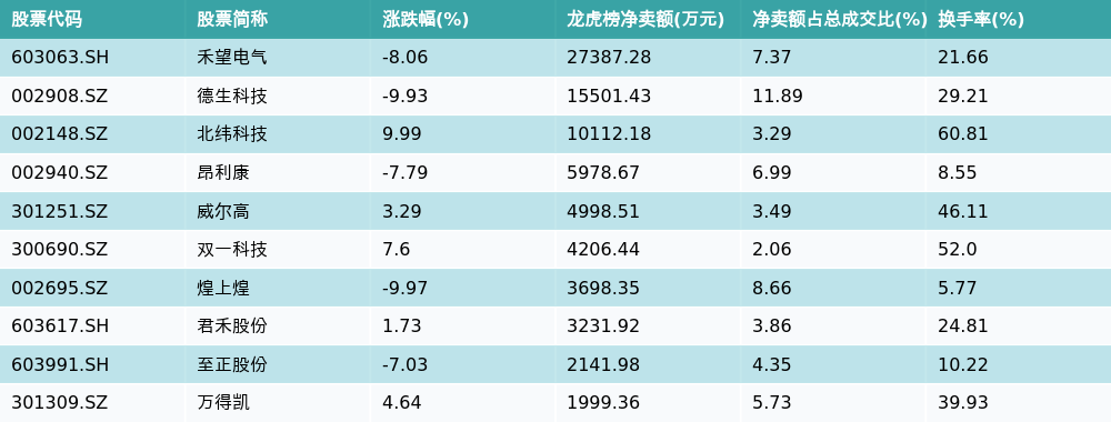 南财智讯8月12日电,南财金融终端数据显示,因当日异动登上龙虎榜的个股中,龙虎榜中资金净流出最多的前三位分别是禾望电气(603063.SH)、德生科技(002908.SZ)与北纬科技(002148.SZ)。其中排名第一的禾望电气被净卖出2.74亿元,占总成交金额的7.37%。禾望电气收盘下跌8.06%,换手率为21.66%。净卖出额前10个股详情见下图: