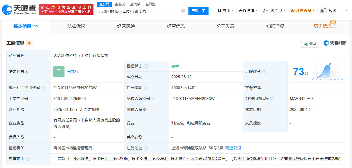 南方财经6月13日电,天眼查App显示,6月12日,美的影像科技(上海)有限公司成立,法定代表人为马赤兵,注册资本1000万人民币,经营范围包括技术服务、技术开发、医学研究和试验发展等。股东信息显示,该公司由美的集团(000333)旗下美的医疗科技(上海)有限公司全资持股。