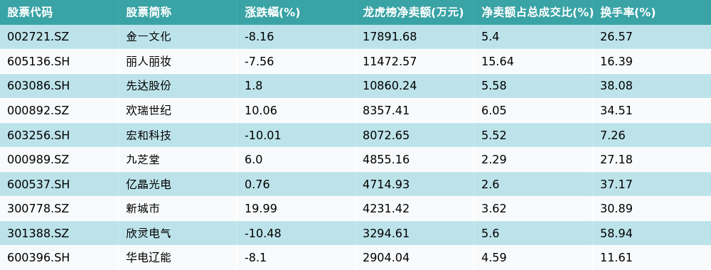 南财智讯7月10日电,南财金融终端数据显示,因当日异动登上龙虎榜的个股中,龙虎榜中资金净流出最多的前三位分别是金一文化(002721.SZ)、丽人丽妆(605136.SH)与先达股份(603086.SH)。其中排名第一的金一文化被净卖出1.79亿元,占总成交金额的5.4%。金一文化收盘下跌8.16%,换手率为26.57%。净卖出额前10个股详情见下图: