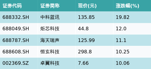 截至午间收盘,智能音箱主题涨跌幅最高的五只股票为:中科蓝讯(688332.SH)、炬芯科技(688049.SH)、海天瑞声(688787.SH)、恒玄科技(688608.SH)与卓翼科技(002369.SZ)。详情见下表: